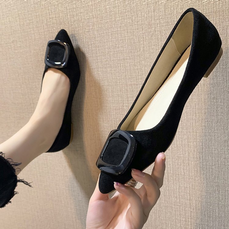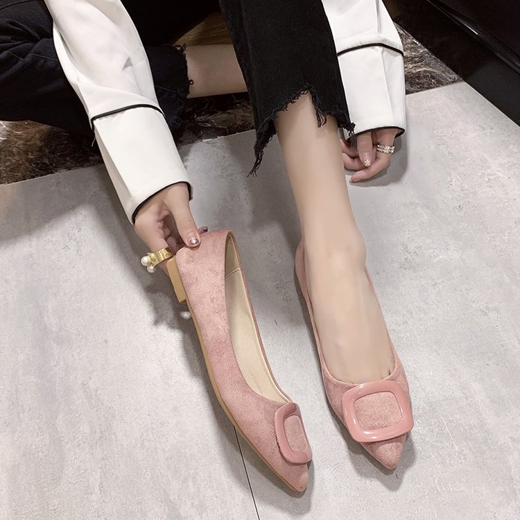 2025新款 春秋尖頭方扣平底舒適不累腳淺口小清新裸粉色甜美工作鞋由