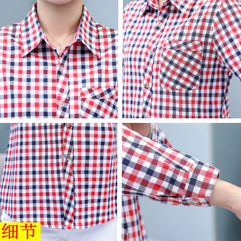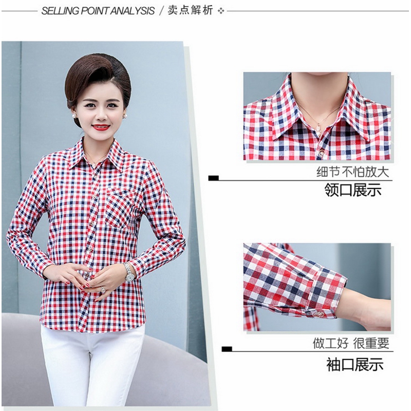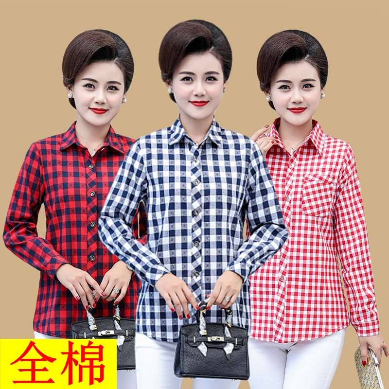 媽媽休閑純棉襯衫 中年女裝 長袖 上衣2024新款 40到50歲媽媽格子襯衫