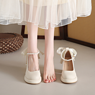 新款 女2025春季 白色瑪麗珍鞋 粗跟高跟小皮鞋 大碼 氣質溫柔單鞋 法式由