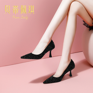 春款 春季 灰色珠片尖頭高跟鞋 子女2025年新款 女百搭 細跟淺口單鞋由