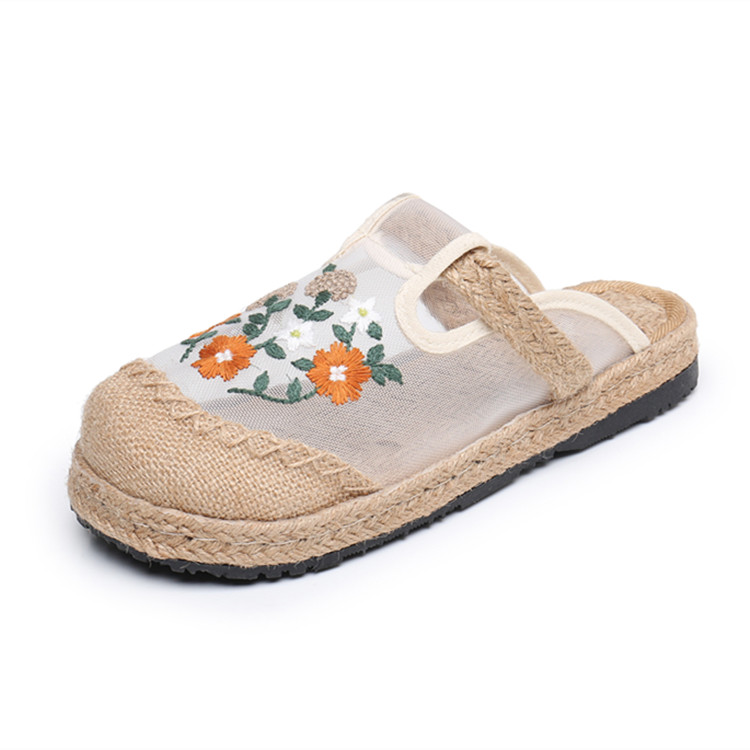 網紅爆款 網紗布拖鞋 亞麻防滑圓頭外穿繡花漢服鞋 輕便透氣 女夏新款由
