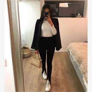 新款 黑色西裝 褲 女秋季 子潮 胖妹妹mm設計感高腰寬松顯瘦休閑闊腿褲