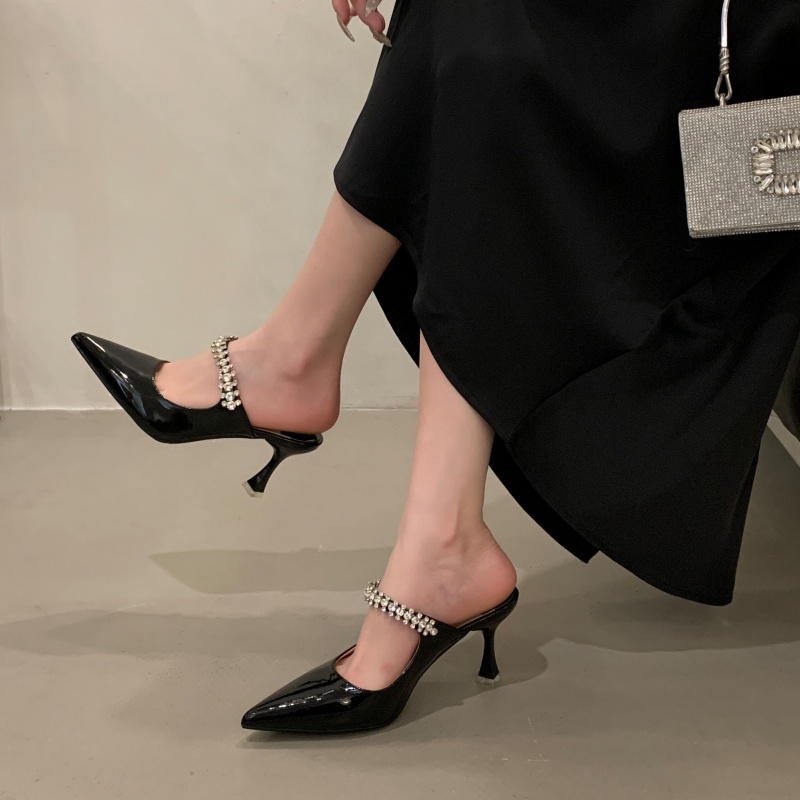 裸色漆皮尖頭半拖2025夏季 一字帶水鉆涼拖鞋 女穆勒細跟高跟鞋 新款由