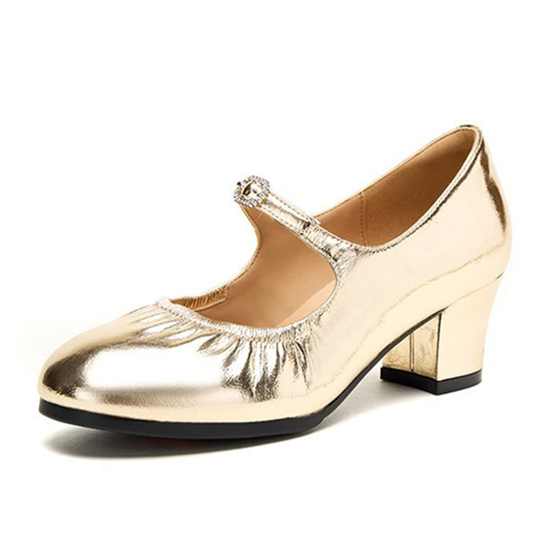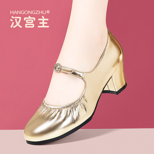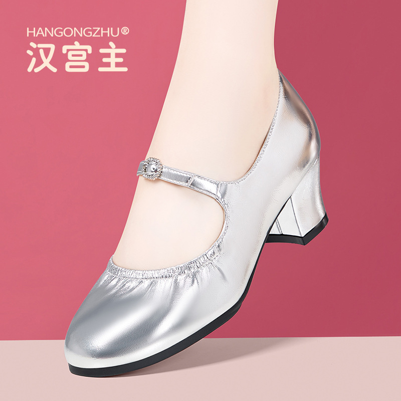 春夏2025羊皮面金色女真皮舞蹈鞋 廣場(chǎng)舞交誼舞粗低跟銀色 新疆舞鞋由