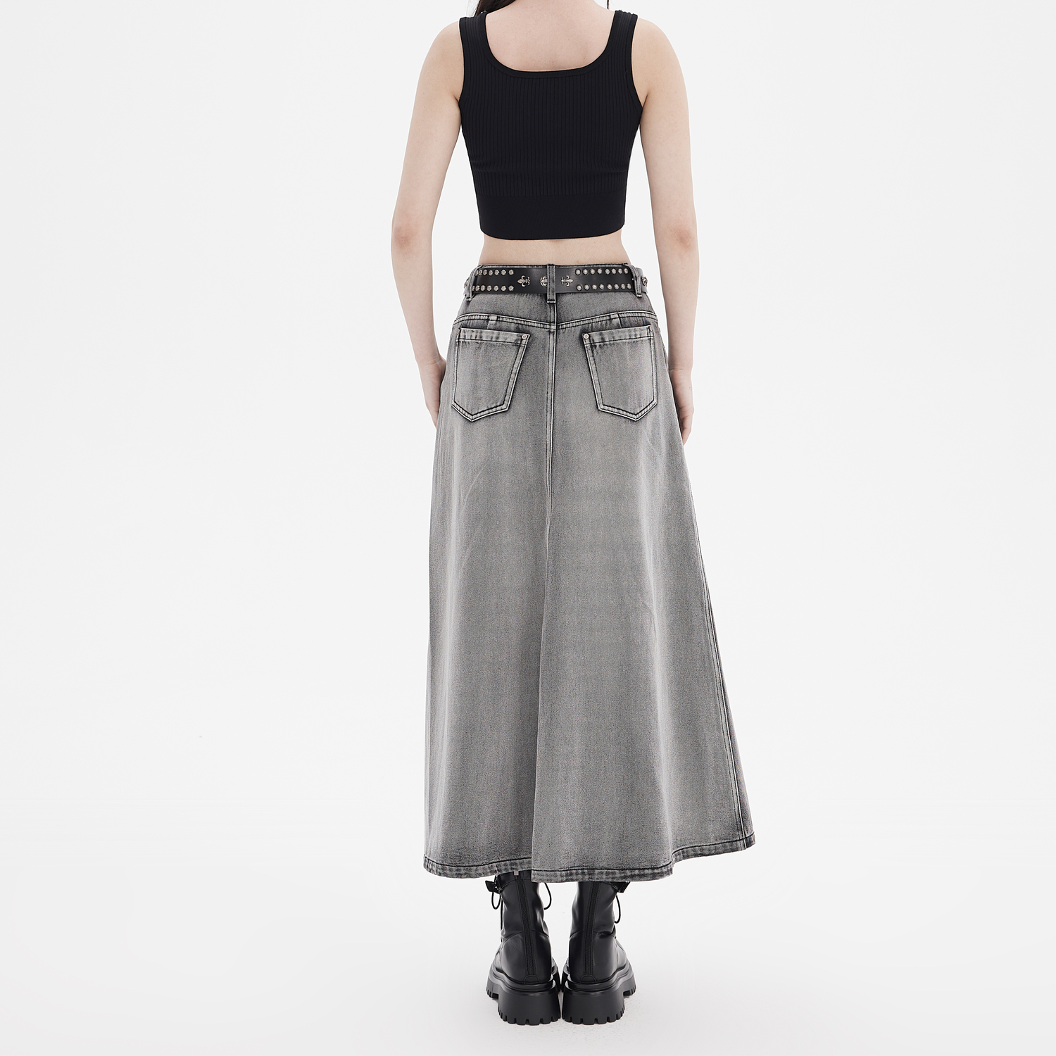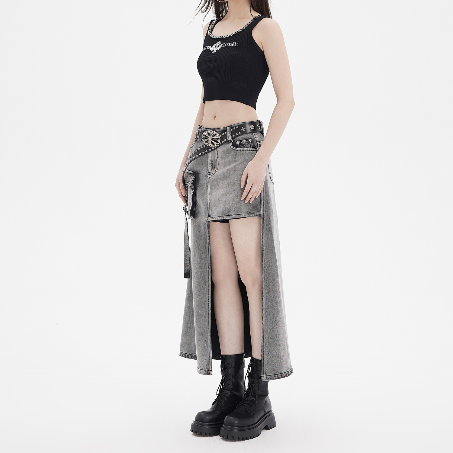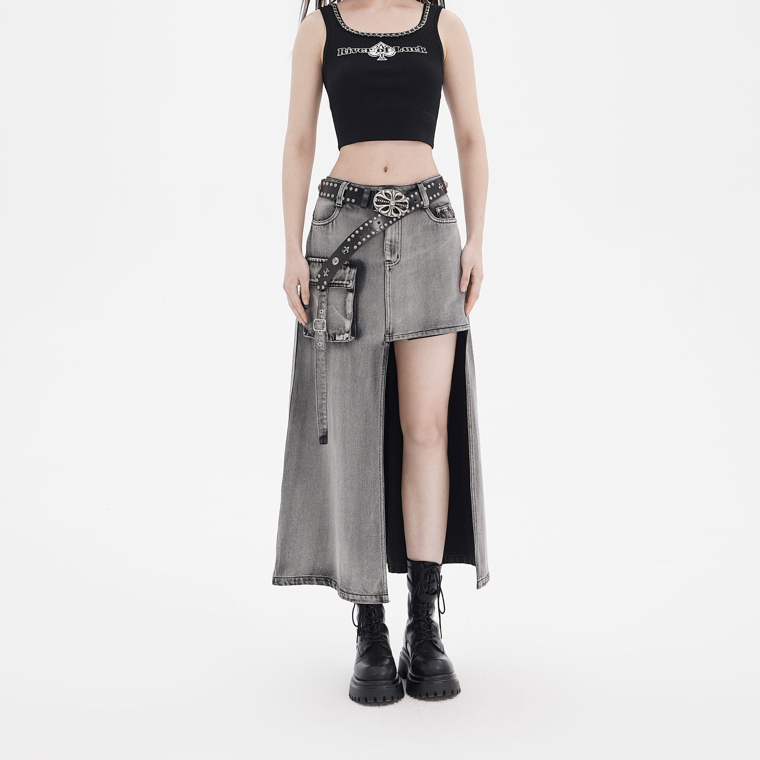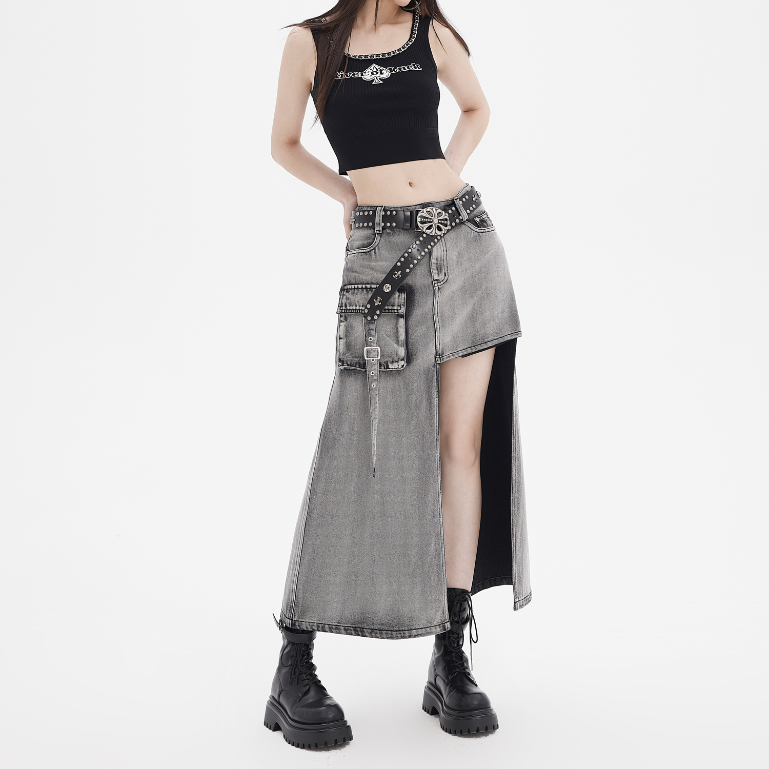 依妙EMU不對稱洗水牛仔半裙2025夏季 拽姐吸睛長裙 街頭個性由