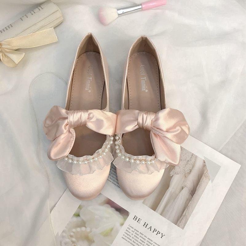 高貨仙女公主珍珠蕾絲蝴蝶結綢緞平底淺口牛筋底配裙子漢服伴娘鞋由