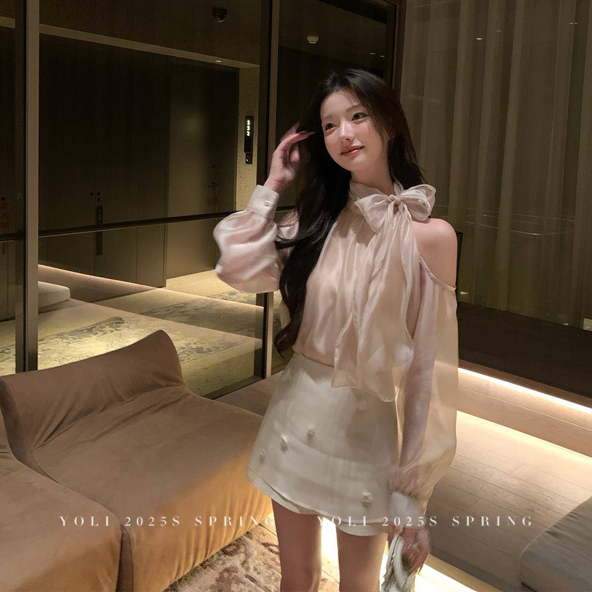 YOLI 巴黎詩(shī)集 杏色溫柔露肩雪紡襯衫 女秋蝴蝶結(jié)細(xì)帶上衣 張宥利由