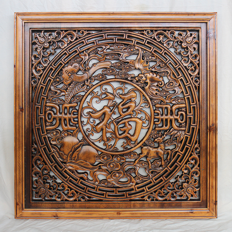 東陽實(shí)木雕刻香樟木質(zhì)雕花中式 飾正方形壁掛件龍鳳麒麟客廳墻飾 裝由