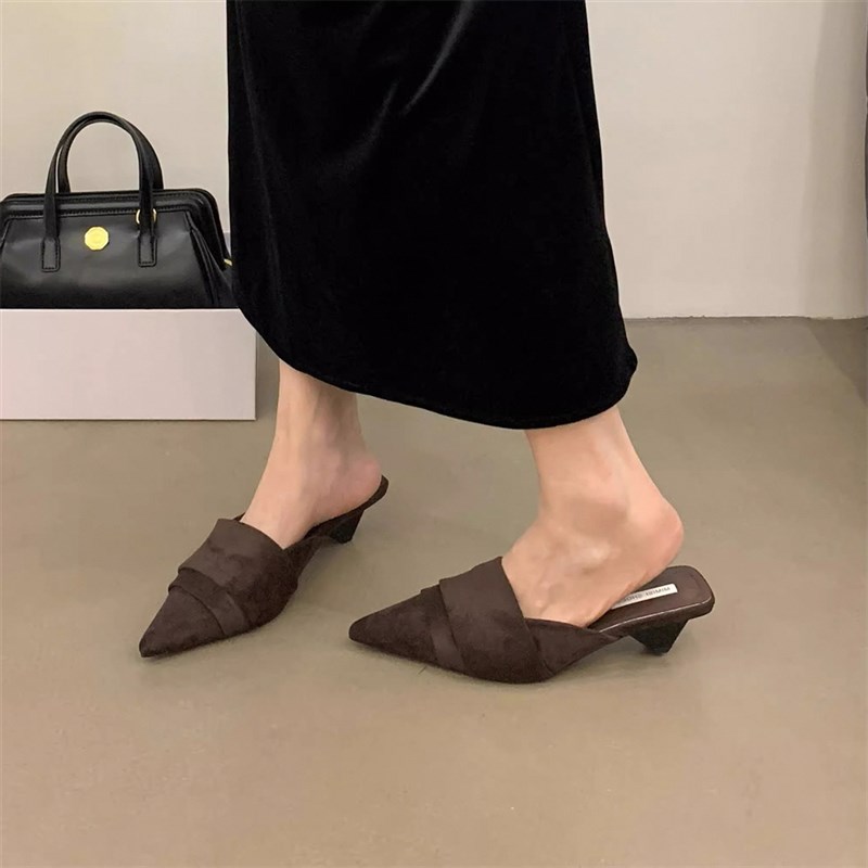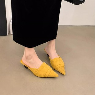 香港小眾覆古包頭半拖鞋 高級感絨面低跟尖頭涼拖 女外穿2025夏新款由