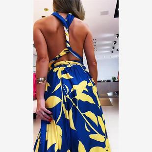 褶皺高腰連衣裙女 shemoda歐美ins風性感露背紐扣掛脖蕩領彈力修身