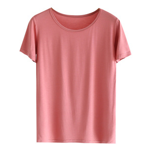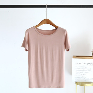 純棉薄款 圓領(lǐng)防凸點 t恤夏季 全棉帶胸墊睡衣女單件上衣免文胸短袖