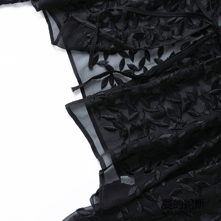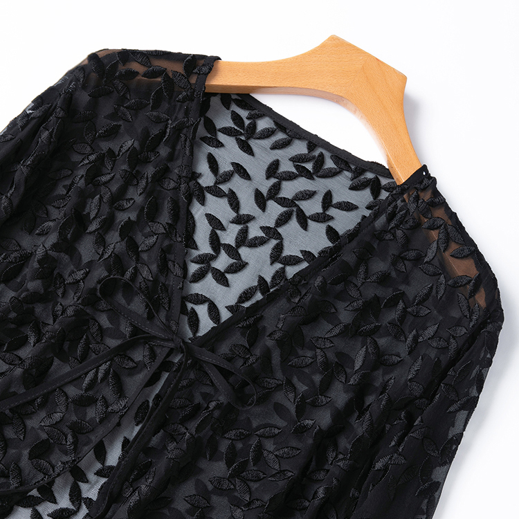 高質感重工刺繡黑色桑蠶絲半透視短款 防曬衣真絲披肩外套系帶開衫由