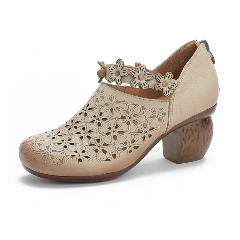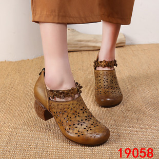 中跟鏤空花朵手工鞋 復古原創包頭民族風 媽媽鞋 058夏真皮軟底涼鞋由