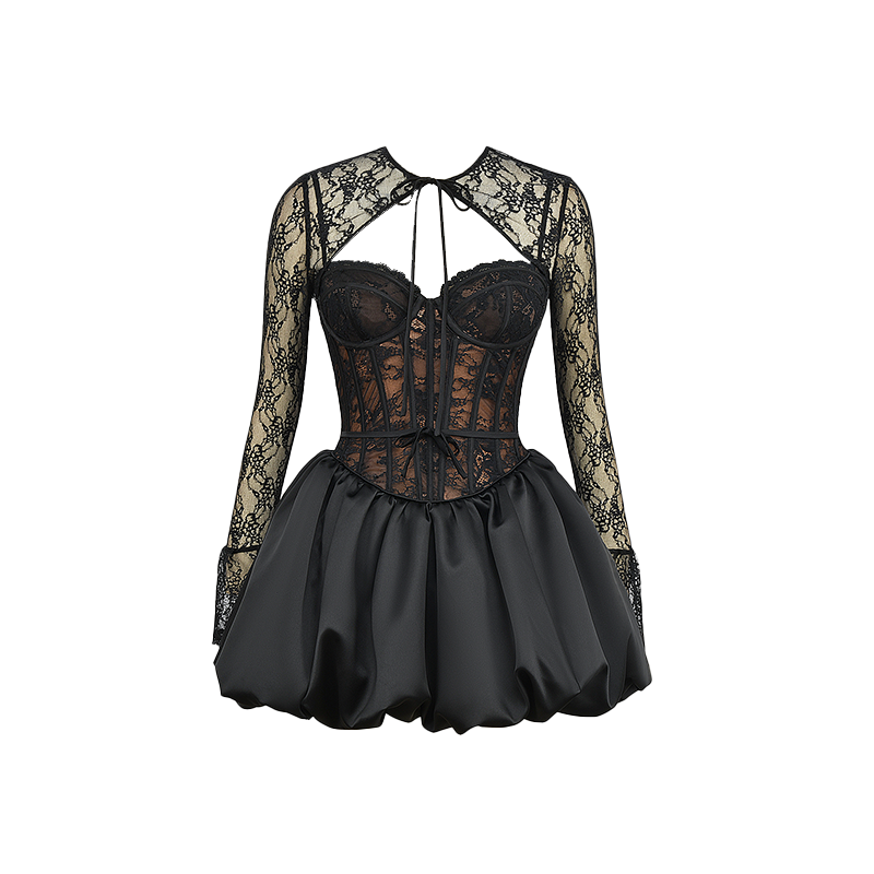 秋冬款 House 黑色蕾絲蓬蓬迷你連衣裙Beauty 系帶領花邊長袖由