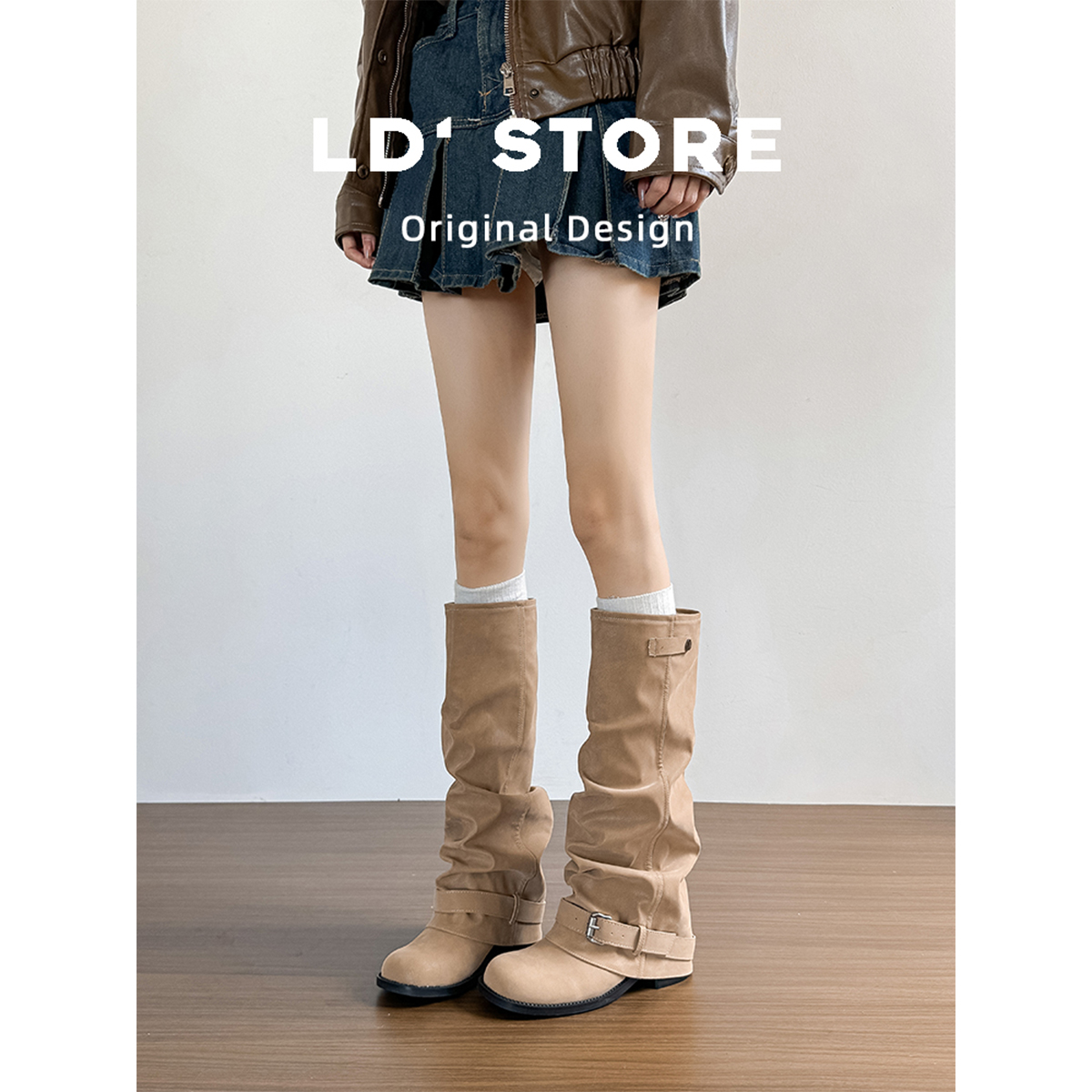 新款 復古褶皺堆堆靴內增高騎士靴 西部牛仔長筒靴女2025秋季 真皮由