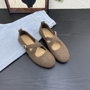 女呢子毛毛鞋 2025秋冬新款 韓版 交叉帶淺口單鞋 女 低跟平底瑪麗珍鞋由