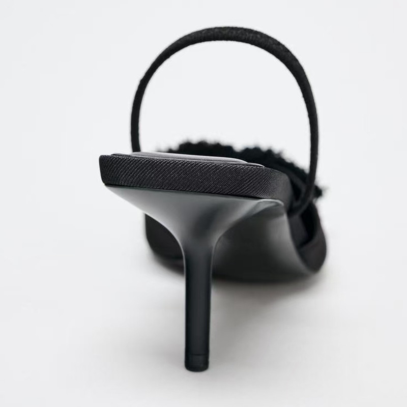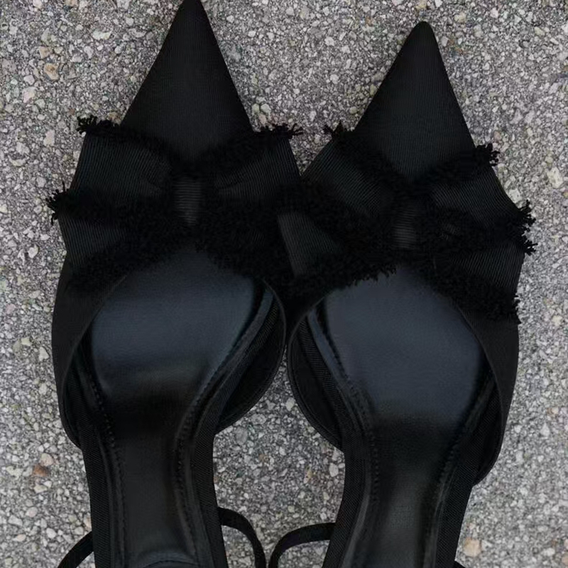 西班牙2025春季 尖頭淺口中空單鞋 黑色蝴蝶結飾露高跟穆勒涼鞋 新品由