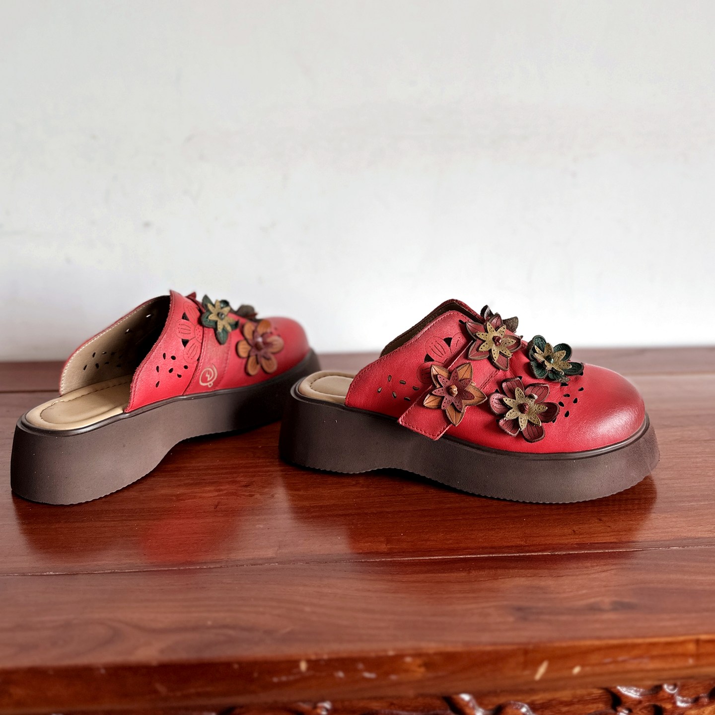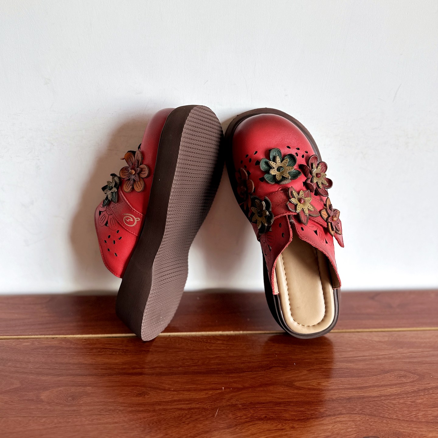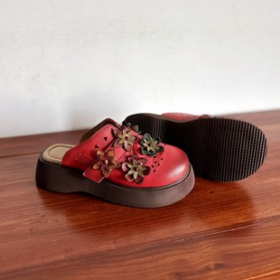 小眾設計唯美花朵真皮女鞋 頭層牛皮中跟厚底包頭半拖鞋 爍掌柜由