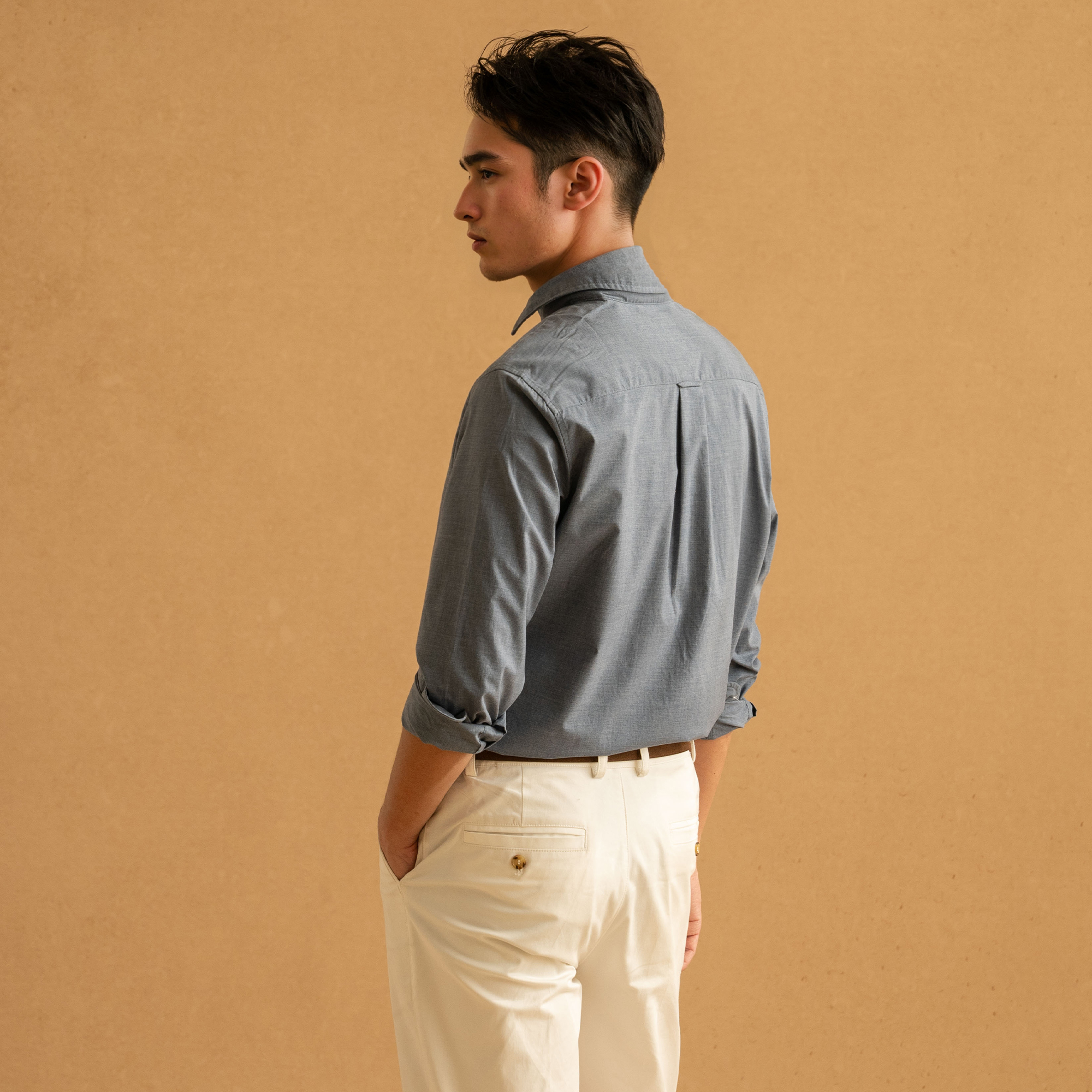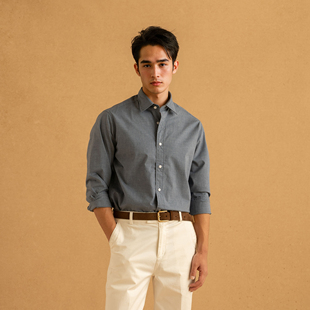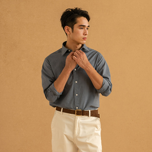 25春夏季 休閑商務老錢風常規(guī)領天絲亞麻混紡藍色長袖 襯衣襯衫 男士由