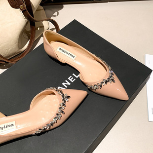 法式 歐洲站2025夏季 新款 單鞋 尖頭氣質輕奢裸粉色水鉆漆皮平底女鞋由