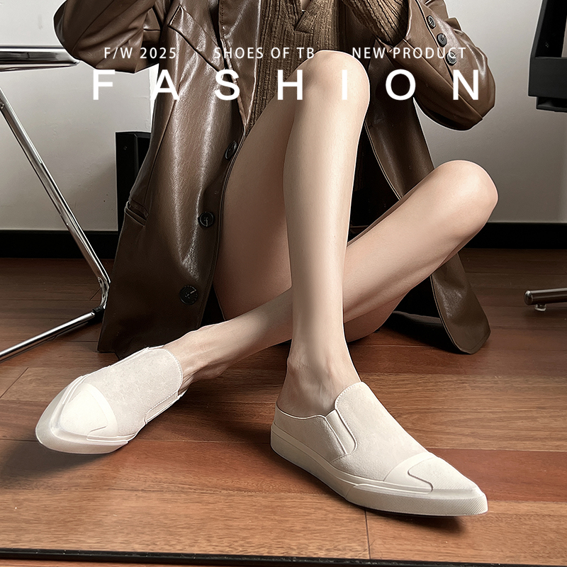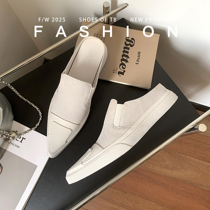2025新款 女外穿真皮尖頭平底單鞋 做舊懶人拖小白鞋 小眾包頭半拖鞋由