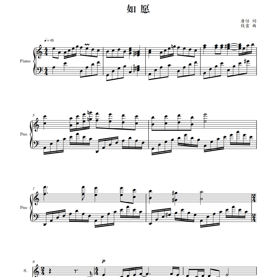 如愿合唱譜二聲部合唱五線譜總分譜簡譜合唱譜分聲部音頻鋼琴伴奏由