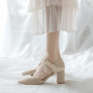 女夏仙女風2023外穿包頭蝴蝶結粗跟中跟法式 瑪麗珍 涼鞋 氣質高跟鞋由