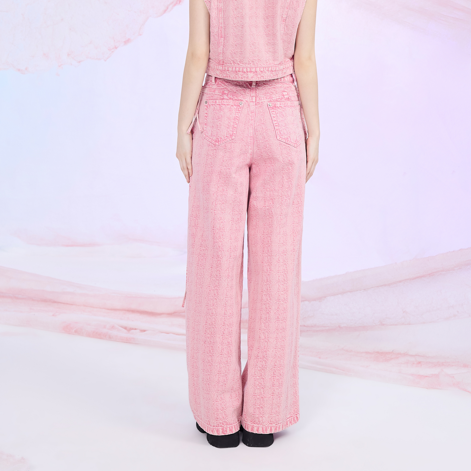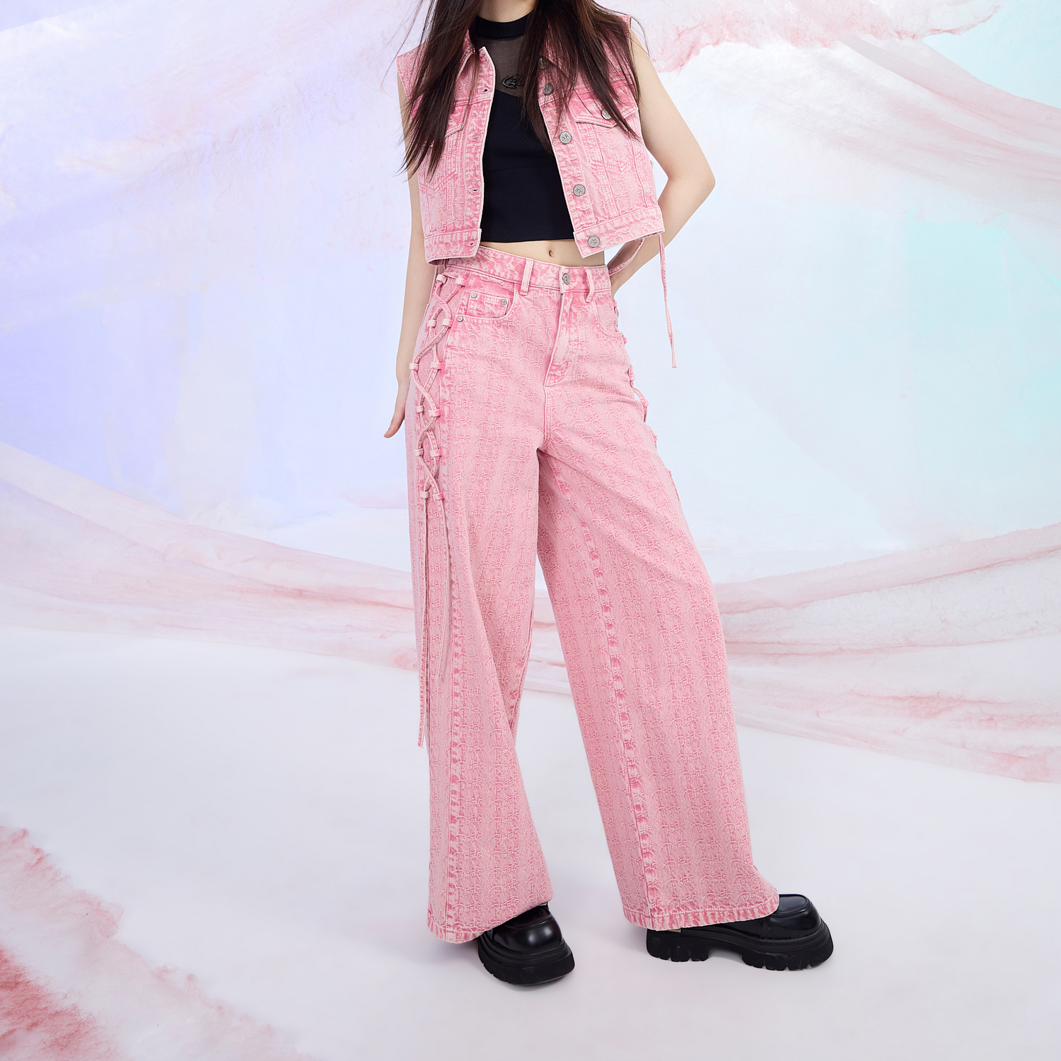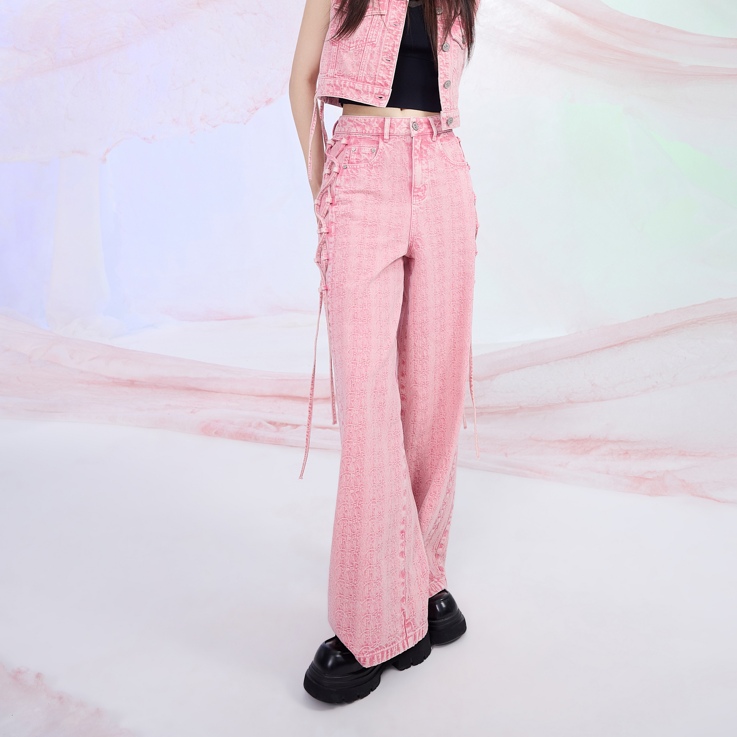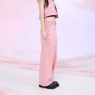 依妙EMU側綁帶闊腿牛仔褲 新款 高腰寬松長款 女粉色 2025夏季由