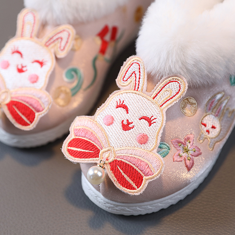 兔子兒童毛毛棉靴拜年鞋 加絨加厚軟底繡花鞋 女童漢服棉鞋 2025冬款由