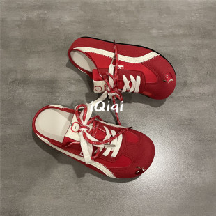 板鞋 七七主人家 懶人一腳蹬半拖鞋 子女2025新款 復古大紅色德訓鞋由