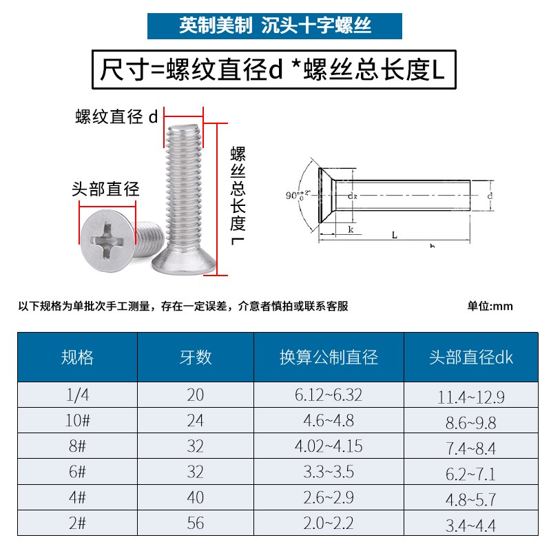 SZ英美制304不銹鋼沉頭十字槽螺絲釘平頭螺栓2 20牙由