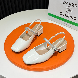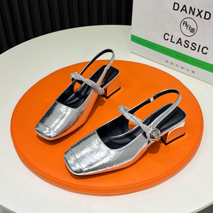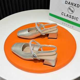 水鉆一字帶瑪麗珍中跟單鞋 女2025新款 丹行道香檳方頭粗跟包頭涼鞋由