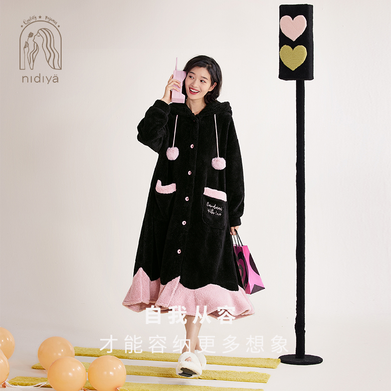 妮狄婭睡衣睡袍女秋冬季 休閑浴袍家居服 加厚保暖珊瑚絨連帽中長款由