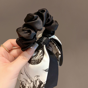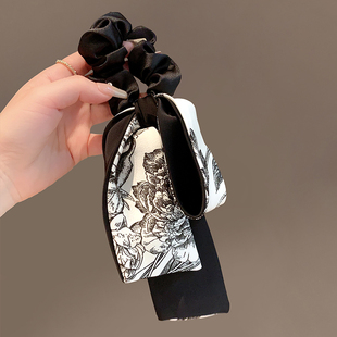 國潮水墨清冷印花圖案發圈氣質緞面飄帶蝴蝶結低馬尾發繩發飾 中式由