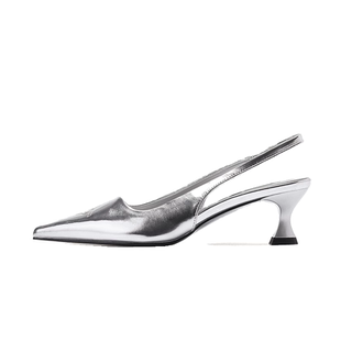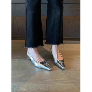 銀色方頭高跟鞋 法式 氣質(zhì)百搭淺口貓跟后空包頭涼鞋 女2025秋冬新款由