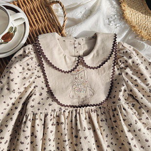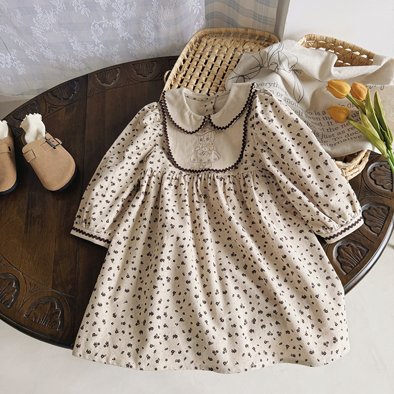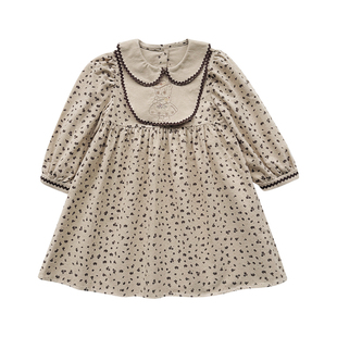 韓版 娃娃領小熊繡花女童連衣裙2025秋款 撞色復古長袖 碎花裙子 童裝由