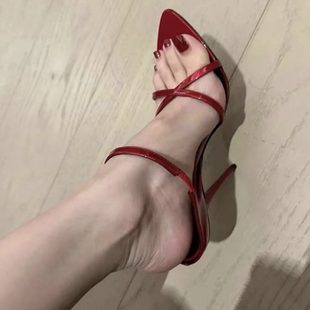 涼鞋 性感 尖頭露趾后空鞋 外穿春夏女酒紅色細跟帶2023細高跟涼拖鞋由