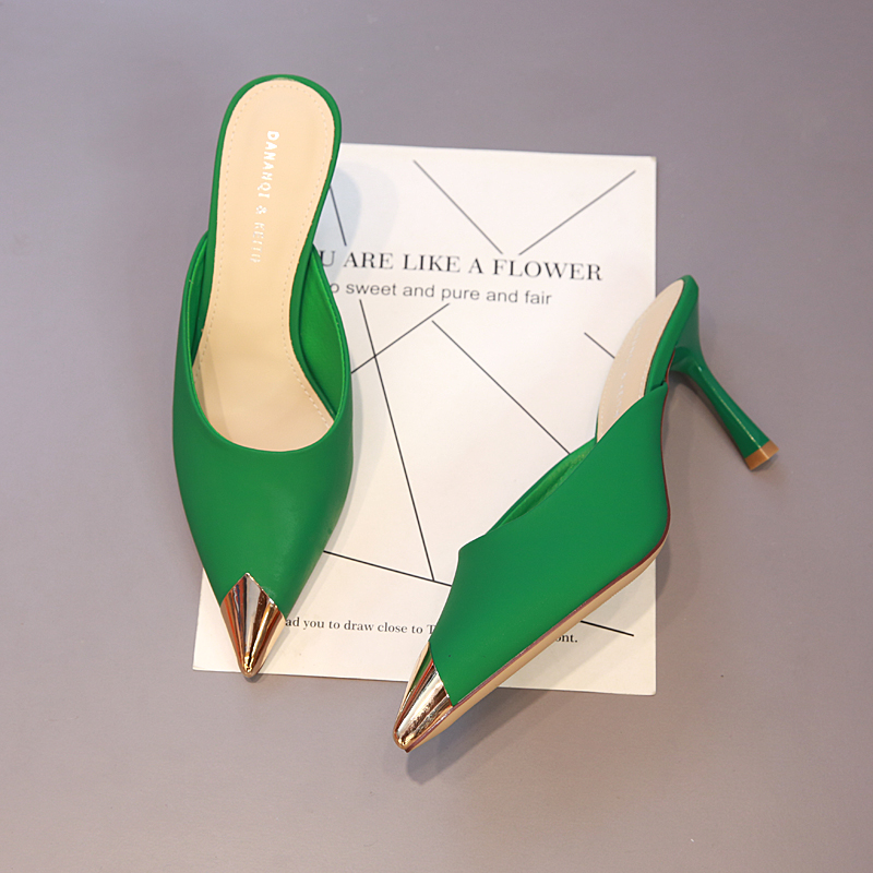 仙女防撞金屬尖頭半拖鞋 新款 通勤包頭涼拖細跟高跟鞋 女2023年夏季由