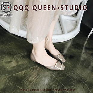 2025夏季 chips大象灰漆皮rv方扣中空單鞋 女 平底方頭涼鞋 新款由