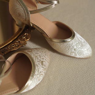 民國中空瑪麗珍涼鞋 復古淺金杏仁頭旗袍酒杯低粗跟單鞋 奈里法式由
