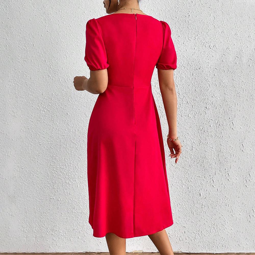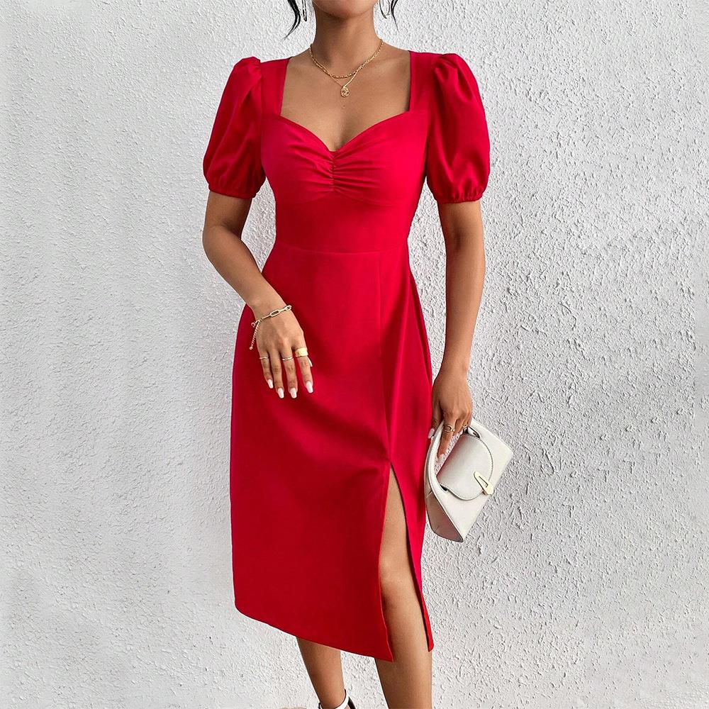Womens Slit Skirt Puff Pleated Line Chest Neck Square由