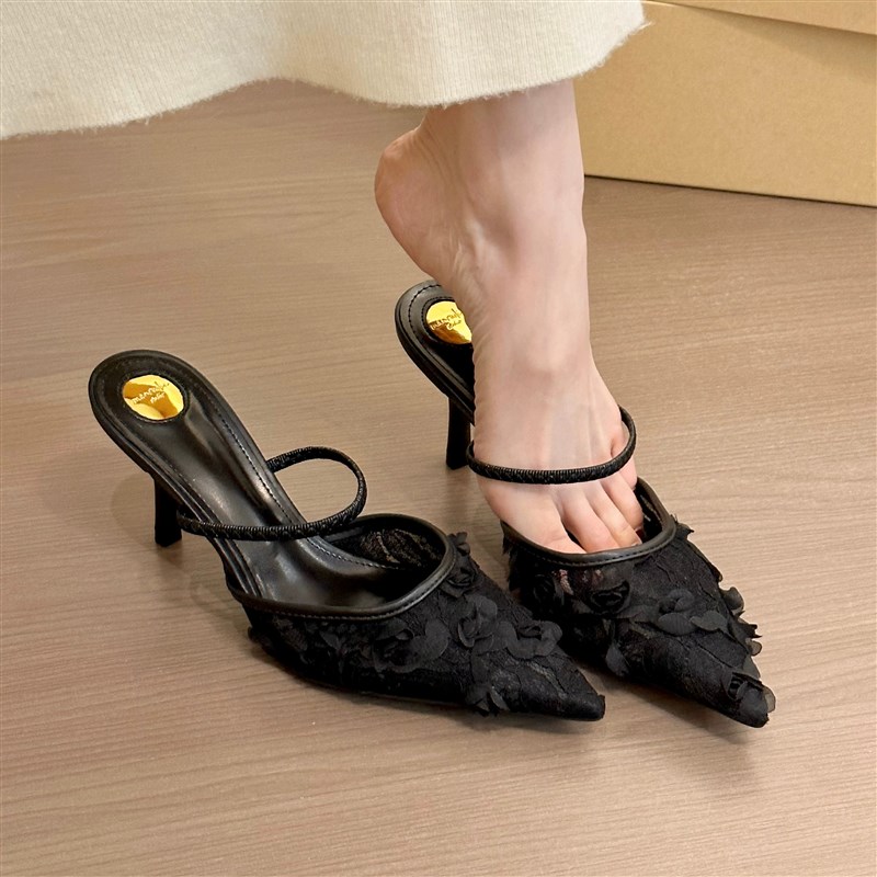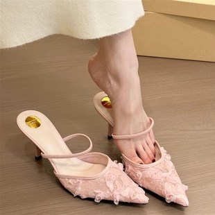 現貨速發粉霧玫瑰 春2025春夏網紗 溫柔尖頭一字帶包頭細跟半拖鞋由