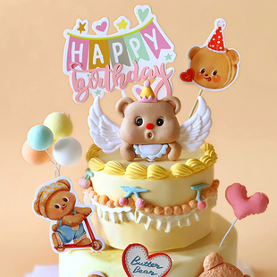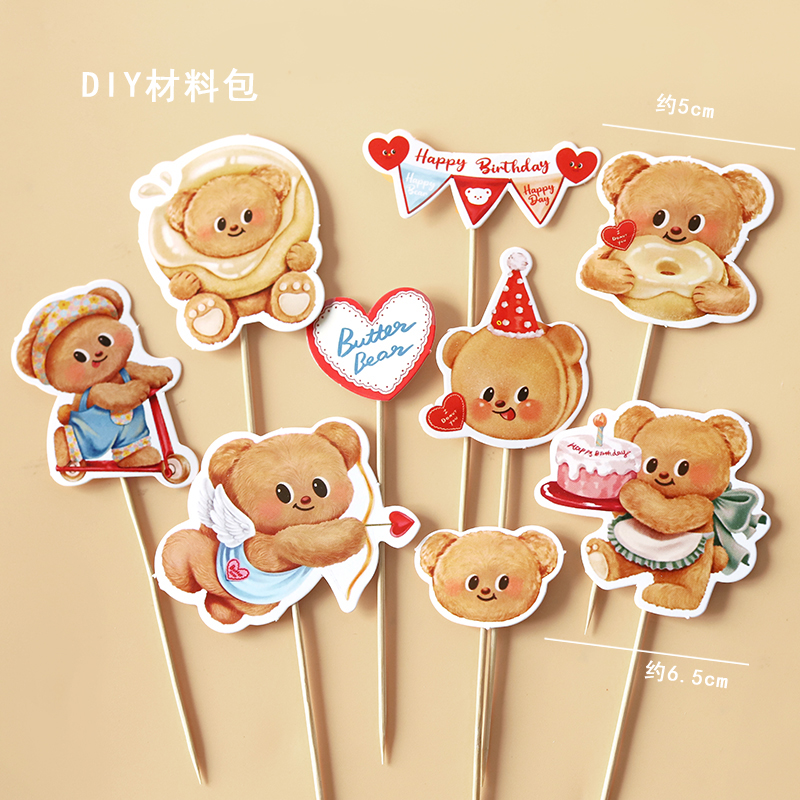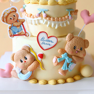 飾插件 網(wǎng)紅黃油小熊藍(lán)蝴蝶圍裙插件烘焙卡通可愛生日派對蛋糕裝由