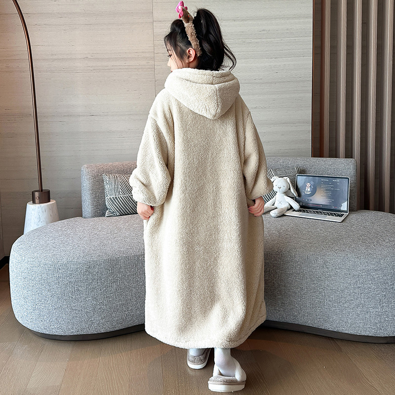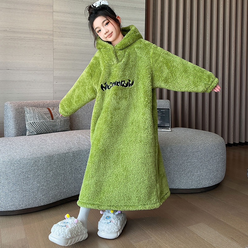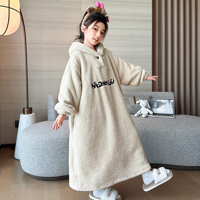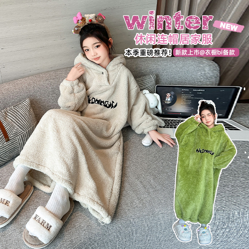 珊瑚絨睡裙秋冬加厚洋氣收裙口法蘭絨連帽睡袍保暖家居裙 女童長款由