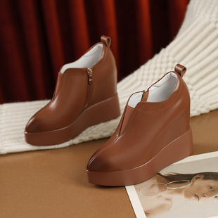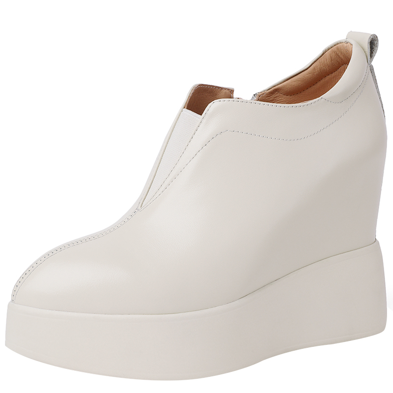 米白色尖頭厚底松糕鞋 真皮百搭春秋單鞋 北西迪12CM真皮內增高女鞋由