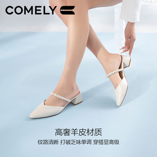 羊皮粗跟尖頭真皮半拖瑪麗珍鞋 女2024夏商場新款 康莉外穿包頭拖鞋由