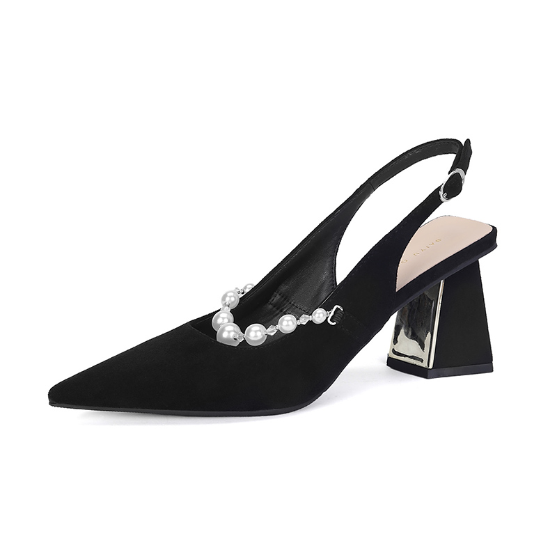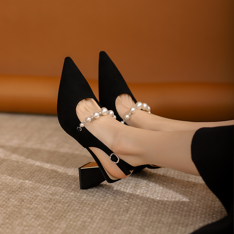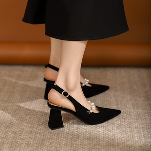 女粗跟配裙子旗袍尖頭設(shè)計(jì)感小眾珍珠包頭涼鞋 絕美黑色高跟鞋 法式由