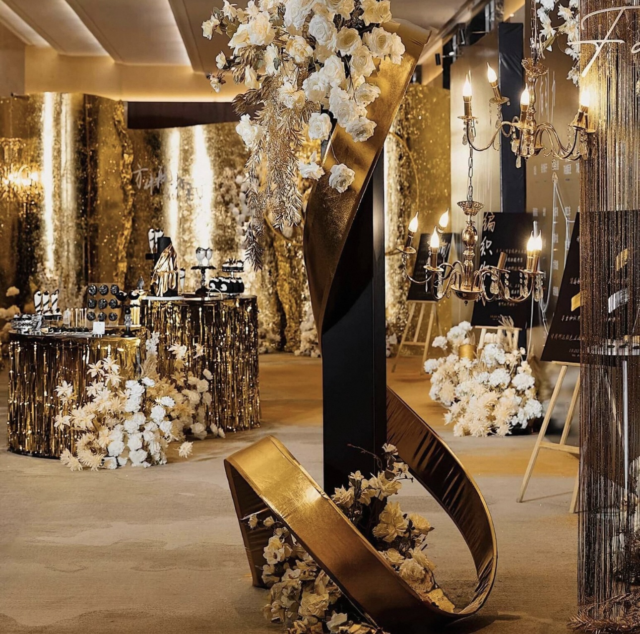 金色婚慶陽光板自由曲線波浪弧形燙金布造型婚禮布置道具吊頂由