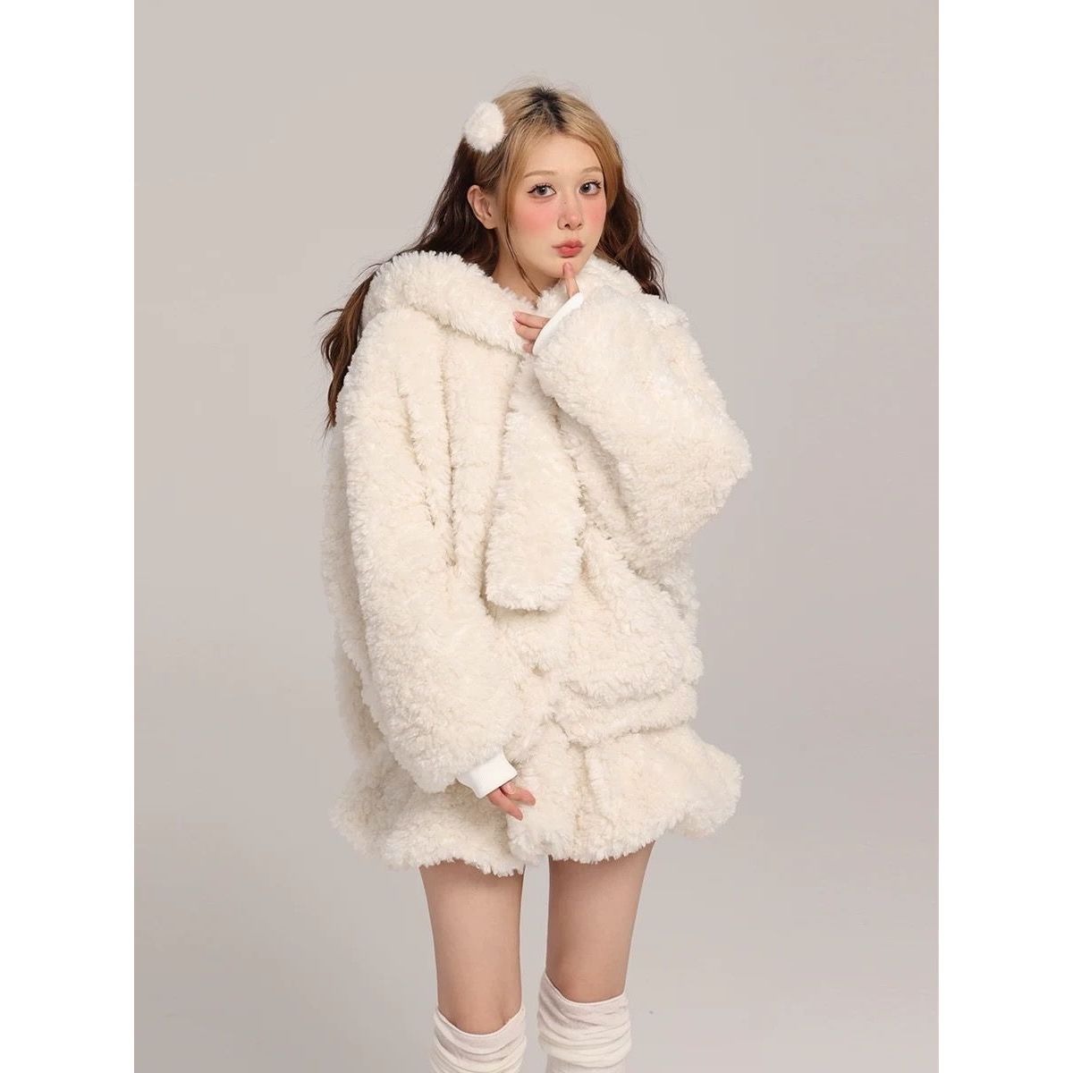 新款 可愛小熊毛絨耳朵連帽毛絨絨保暖外套上衣短裙女 冬季 奶系套裝由