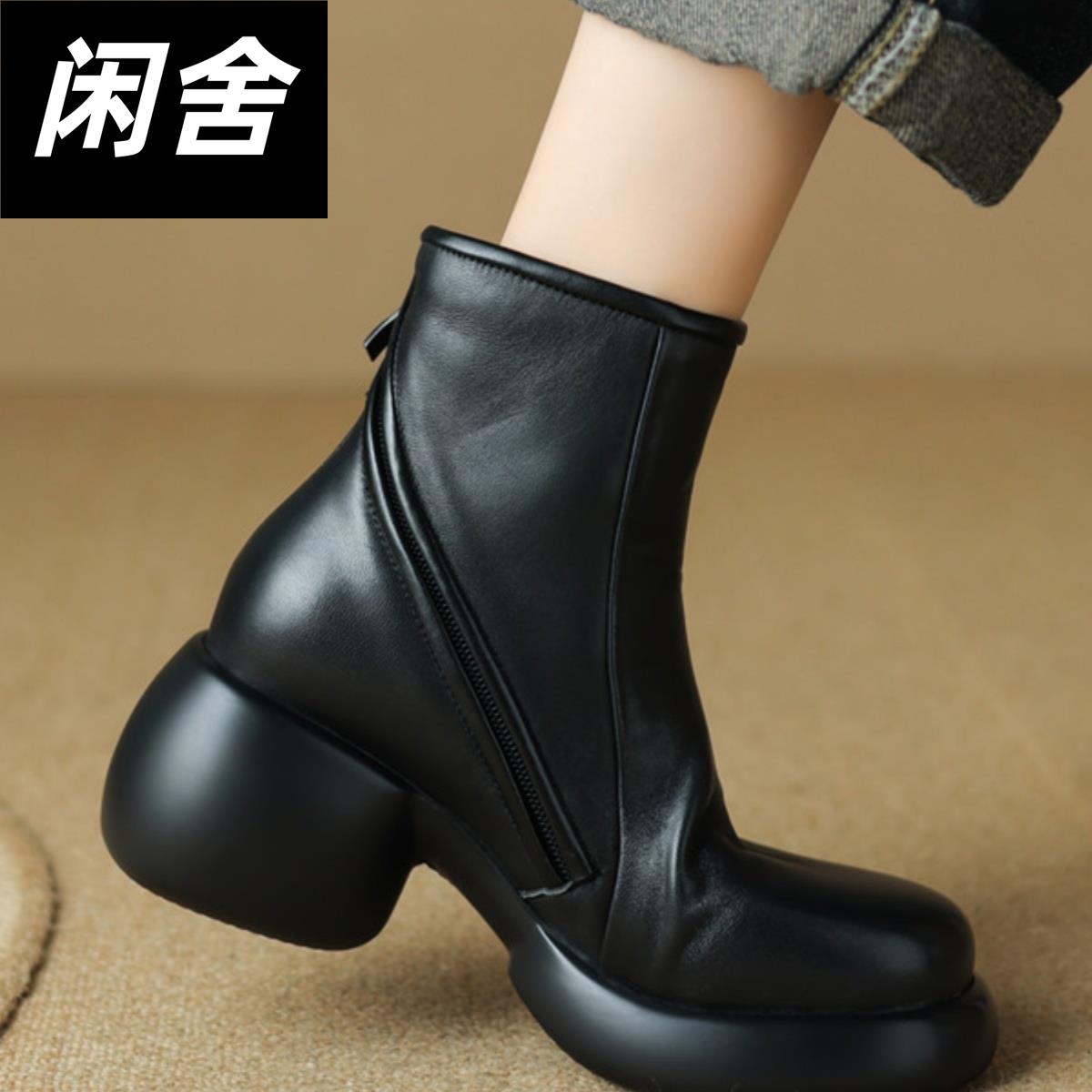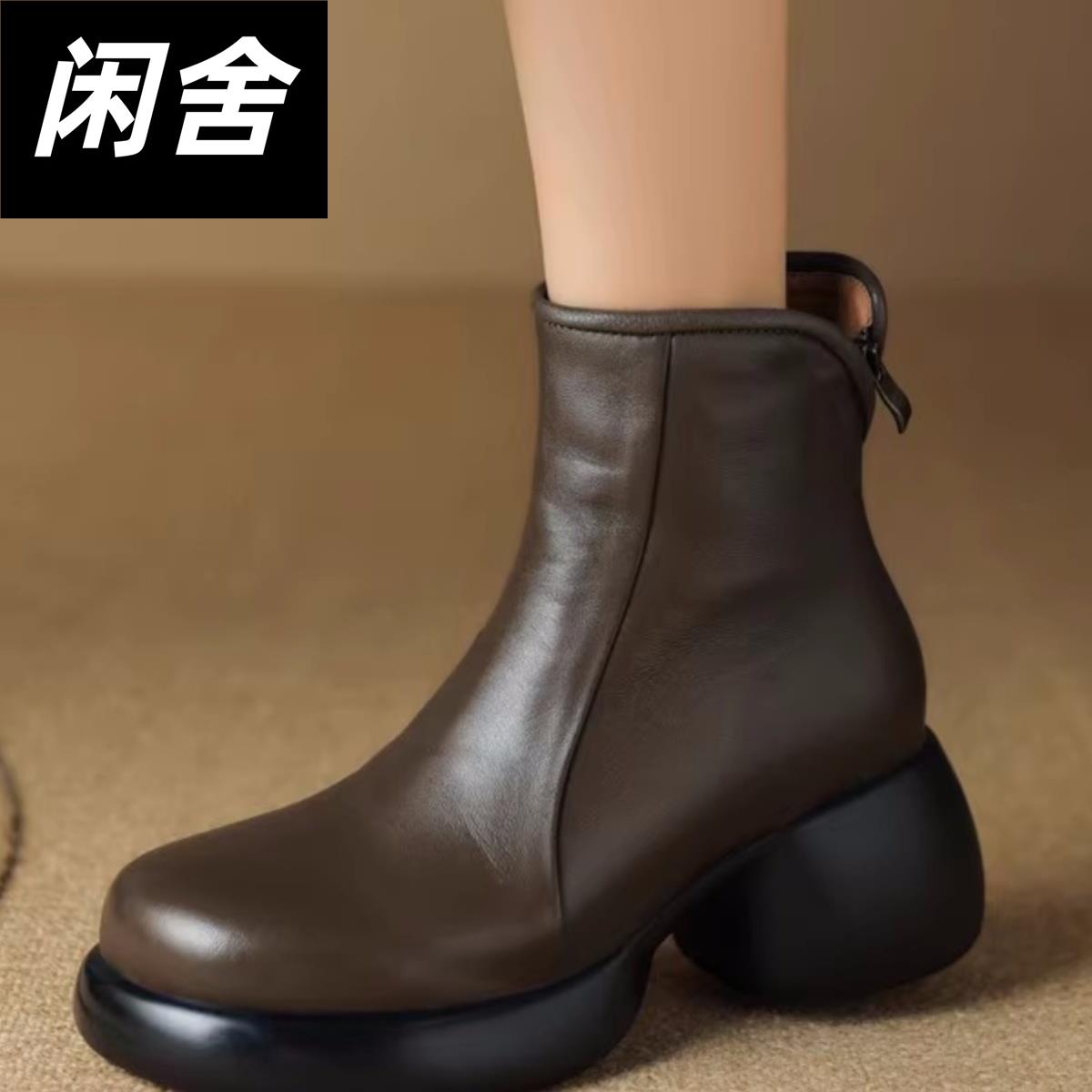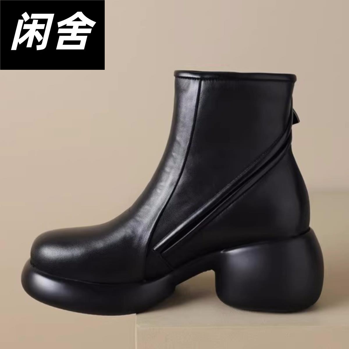 秋冬真皮厚底大頭短靴復(fù)古高幫大黃靴 內(nèi)增高馬丁靴女靴子2025新款